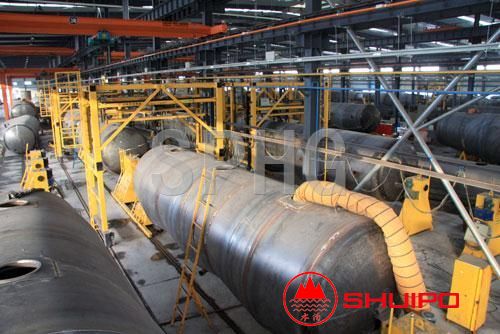 罐體制造自動化生產線研發了罐體制造從鋼板下料、板材銑邊、鋼板對接、卷筒、整形、組裝、焊接、成形等加工工序的先進制造工藝和各工工序上自動化制造裝備;開發一套遠程集中控制系統,實現制造工藝編制、生產計劃安排、生產過程監控、生產和物料管理等一體化控制。